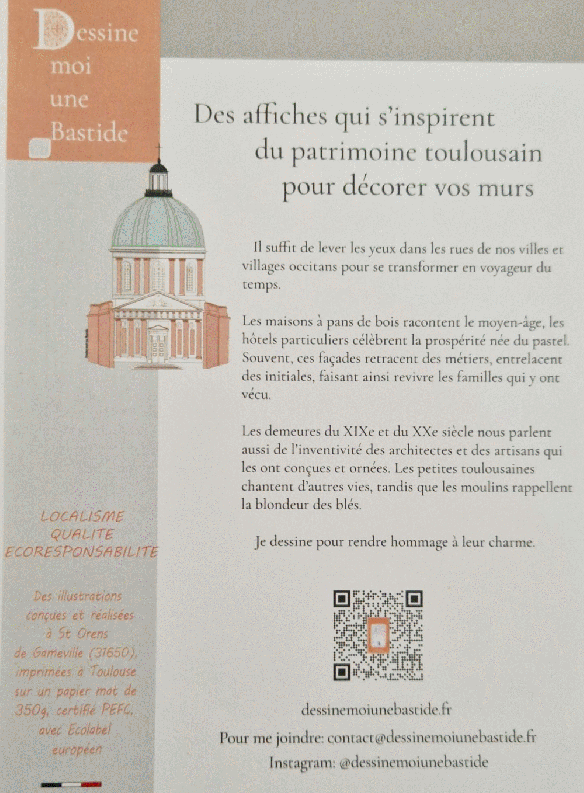 Dessine-moi une Bastide fait son entrée à l’Atelier des Nymphéas. Des affiches qui s’inspirent du patrimoine toulousain et sa région. Une reproduction de votre maison ou un monument de votre préférence peut être illustrée à votre demande. Venez-vous inspirer de quelques-unes de ces œuvres aux travers divers tableaux, marques-pages ou pêle-mêle.